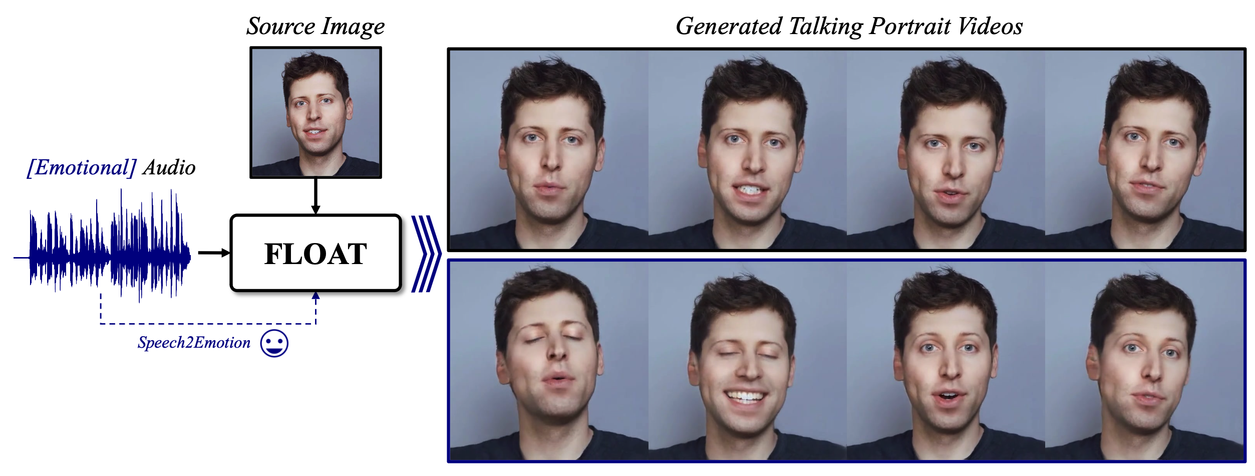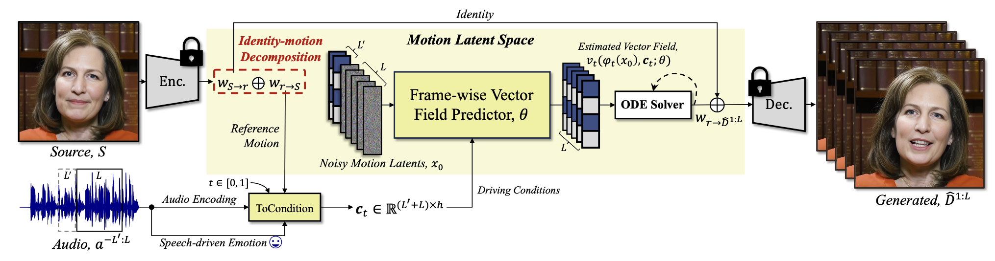 Audio-driven talking portrait aims to synthesize talking portrait videos using a single source portrait image and driving audio. FLOAT is built upon a motion latent auto-encoder that encodes the given portrait image into an (identity-motion) latent representation. We generates audio-conditioned talking portrait motion latents through the flow matching (with optimal transport trajectories). To enhace the naturalness of generated talking motion, we incorporate the speech-driven emotion labels (😀), providing a natural approach of emotion-aware talking portrait motion generation.