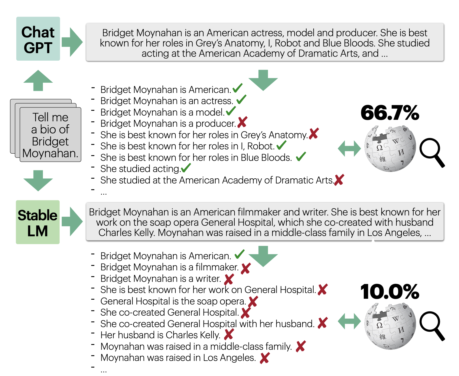 FActScore is a recent example of a metric that can be used both for human and model-based evaluation. The metric breaks an LLM generation into “atomic facts”. The final score is computed as the sum of the accuracy of each atomic fact, giving each of them equal weight. Accuracy is a binary number that simply states whether the atomic fact is supported by the source. The authors implement different automation strategies that use LLMs to estimate this metric.