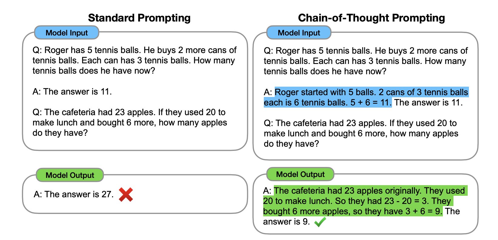 Chain of thought was initially described in the “Chain-of-Thought Prompting Elicits Reasoning in Large Language Models” paper by Google researchers. The simple idea here is that given that LLMs have been trained to predict tokens and not explicitly reason, you can get them closer to reasoning if you specify those required reasoning steps. Here is a simple example from the original paper: