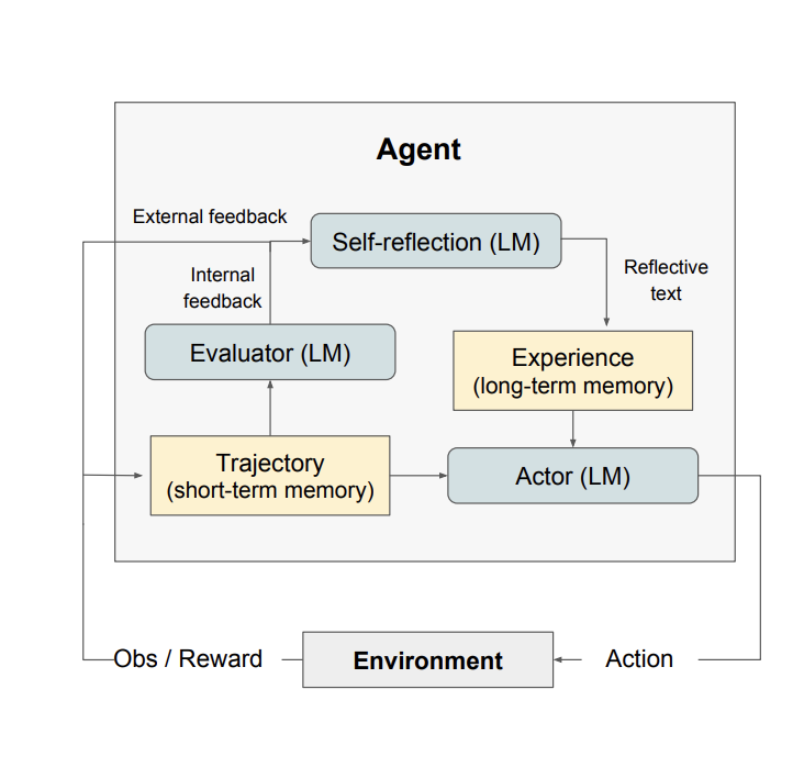 The Reflexion paper proposes an approach defined as “reinforcement via verbal reflection” with different components. The actor, an LLM itself, produces a trajectory (hypothesis). The evaluator produces a score on how good that hypothesis is. The self reflection component produces a summary that is stored in memory. The process is repeated iteratively until the Evaluator decides it has a “good enough” answer. The authors show through experiments how reflection greatly improves the ability of detecting hallucinations even when compared to a ReAct agent.