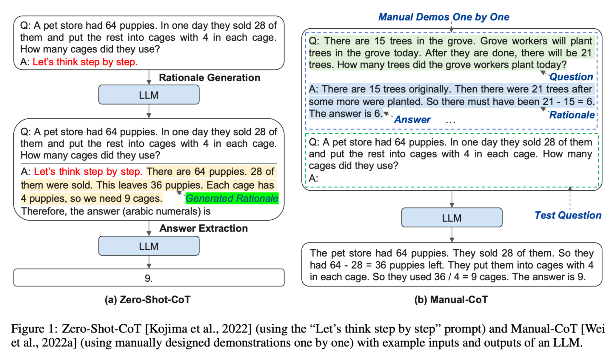 Note that in this case the “required reasoning steps” are given in the example in blue. This is the so-called “Manual CoT”. There are in fact two ways of doing basic chain of thought prompting (see below). In the basic one, called zero-shot CoT, you simply ask the LLM to “think step by step”. In the more complex version, called “manual CoT” you have to give the LLM examples of thinking step by step to illustrate how to reason. Manual prompting is more effective, but harder to scale and maintain.